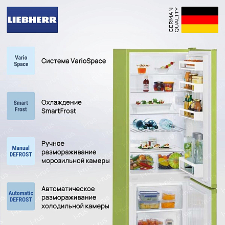 В холодильниках Либхерр автоматическая разморозка представлена системой NoFrost. Она препятствует образованию инея на продуктах за счет интенсивной работы испарителя, который собирает конденсат и выводит его наружу. Однако данная система может подсушивать воздух, из-за чего рекомендуется хранить продукты в упаковках.