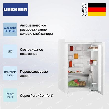 Холодильник Liebherr RD 1200 — компактный однокамерный прибор болгарской сборки, предлагающий продуманный баланс между эргономикой, экономичностью и надежностью в рамках серии Pure (класс Pure/Comfort) с двухлетней гарантией. В корпусе из стали и стальной дверцей в белом цвете скрываются 110 литров полезного объема (113 л брутто), распределенные по рациональной внутренней компоновке: четыре стеклянные полки, три из которых регулируются по высоте, вместительная овощная емкость и три полочные секции на дверце из пластика, включая отделение для бутылок и два отсека для консервов, а также подставка для яиц. Благодаря габаритам 85 х 50 х 60,7 см модель удобно встраивается под столешницу или используется как самостоятельная напольная установка, при этом дверной упор расположен справа, но дверь перевешивается, а угол открытия достигает 211° — это обеспечивает простой доступ даже в ограниченном пространстве.