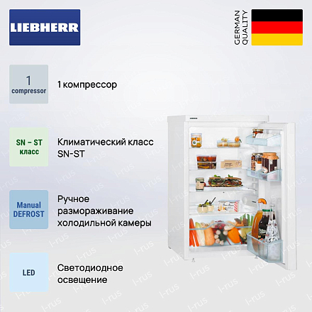Холодильник Liebherr T 1400 — компактная однокамерная модель из линейки Comfort. Благодаря строгому дизайну и размерам может использоваться в любом помещении, от гостиной до офиса или бара. Специальная технология позволяет установить ее в нише, шкафчике и т.п. Продуманная конструкция и интуитивно понятное управление в сочетании с экономичностью делают ее универсальным решением для самых разных задач.