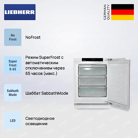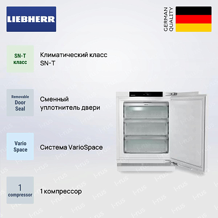 Liebherr SUFND 365i — встраиваемая морозильная камера, сочетающая продуманный дизайн и надежные технологии для комфортной повседневной эксплуатации. Корпус и дверь выполнены из стали с элегантной скрытой ручкой, что обеспечивает строгую и лаконичную внешность при встраивании под столешницу; жесткое крепление двери по системе Door-on-door позволяет ровно интегрировать фасад до 10 кг, а возможность перевешивания петли дает гибкость при планировке мебели. Компактные габариты 81,9 х 59,7 х 55,6 см и рекомендованные размеры ниши 82–88 х 60 х 56 см делают агрегат подходящим для большинства кухонных модулей, при этом вентиляция осуществляется через цоколь, а регулировка ножек обеспечивает точную подгонку по высоте.