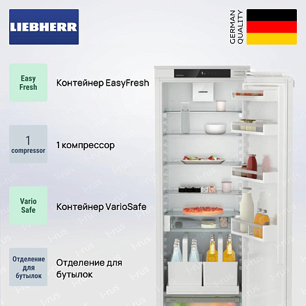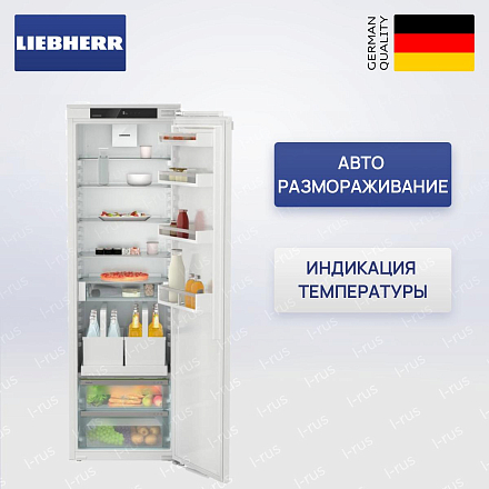 Встраиваемый холодильник Liebherr IRDe 5120 состоит из одной камеры. Морозилка не предусмотрена. Вы можете смонтировать его рядом с морозилкой Либхерр или установить отдельно. Благодаря значительному внутреннему объему и продуманному наполнению, устройство может вместить в себя большое количество разнообразных продуктов. Предусмотрены специальные опции и настройки, которые делают эксплуатацию прибора еще более комфортной.