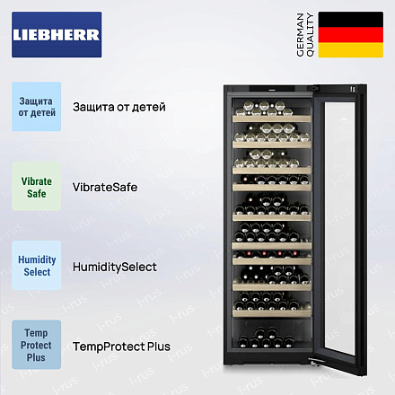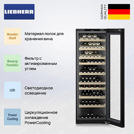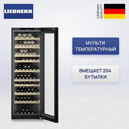 Винный шкаф Liebherr WPGBI 7472 представляет собой высокотехнологичную отдельностоящую модель, разработанную для коллекционеров и профессионалов, которым важны стабильность микроклимата и продуманный дизайн; срок гарантии на прибор — 2 года. Корпус выполнен в элегантном черном цвете с боковыми стенками из стали и дверью со стеклопакетом в черной рамке без выступающих ручек, оснащенной встроенной ручкой и интегрированным замком, дверной упор расположен справа с возможностью перенавешивания. Высота прибора 201.3 см, ширина 69.7 см и глубина 76.4 см, габариты в упаковке 208.7×72.2×85.7 см, вес в рабочем состоянии 142.9 кг, в упаковке 151.7 кг. Внутренний полезный объем составляет 551 литр из общего объема 659 литров, что позволяет разместить до 204 стандартных бутылок, размещаемых на десяти полках из натурального дерева, девять из которых установлены на телескопические направляющие для удобного доступа к содержимому.