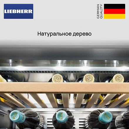 Полки для хранения в винных шкафах Либхер изготовлены из дерева. Это международный стандарт, которого придерживается фирма. У этого решения есть несколько причин. Сам материал выглядит эстетически и позволяет насладиться процессом. Кроме того, в таком оборудовании должна поддерживаться определённая влажность, чтобы пробка не рассохлась. Именно дерево лучше всего на неё реагирует. Рейки, изготовленные вручную, надёжно удерживают бутылки и снижают вибрацию.