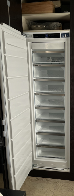 Купил этот встроенный морозильник перед началом дачного сезона и пользуюсь им уже несколько месяцев. Сразу понравилось, что он действительно тихий — на кухне стало спокойнее, даже когда включен режим интенсивной закладки. Перестала надоедать ручная разморозка: система NoFrost срабатывает как обещают, а это экономит время и силы по дому. Первый практический тест был после рыбалки с другом: большую часть улова удалось быстро и равномерно заморозить с помощью режима SuperFrost, чувствовалось, что продукты не теряют текстуру. Это было важно, потому что я обычно делаю запасы на зиму и не люблю, когда еда покрывается ледяной коркой. Панель управления удобная, сенсорная и расположена за дверью — сначала переживал, не будет ли сложно привыкнуть, но всё интуитивно понятно. Один раз была короткая авария с отключением света: морозильник держал температуру, и запас продуктов уцелел, так что переживаний не было. Люблю готовить большие порции супов и соусов, которые потом складываю в ящики; прозрачные выдвижные контейнеры помогают быстро найти нужное. Удобно, что двери можно перевесить — при установке это пригодилось, и фасад встал без проблем. Есть ещё мелочи, которые делают жизнь проще: режим для вечеринок, блокировка от детей и световые сигналы об открытой двери — всё это добавляет уверенности. Важный для меня момент — экономичность: прибор не жрёт электроэнергию, что заметно по счётам, особенно летом.